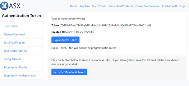 The authentication token can be obtained by logging into Information Services portal via ASXonline and then navigating to the Subscription Authentication screen, https://www.asxonline.com/mia/